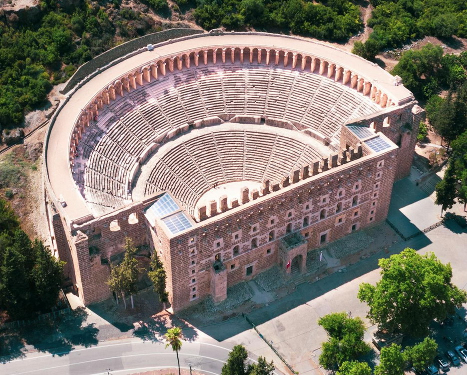 Aspendos is an ancient city located in Serik of Antalya, Turkiye. Renowned for its remarkably well-preserved Roman theater, which dates back to the 2nd century AD. This theater, considered one of the best-preserved examples in the world, could once seat about 15,000 spectators and is notable for its exceptional acoustics.